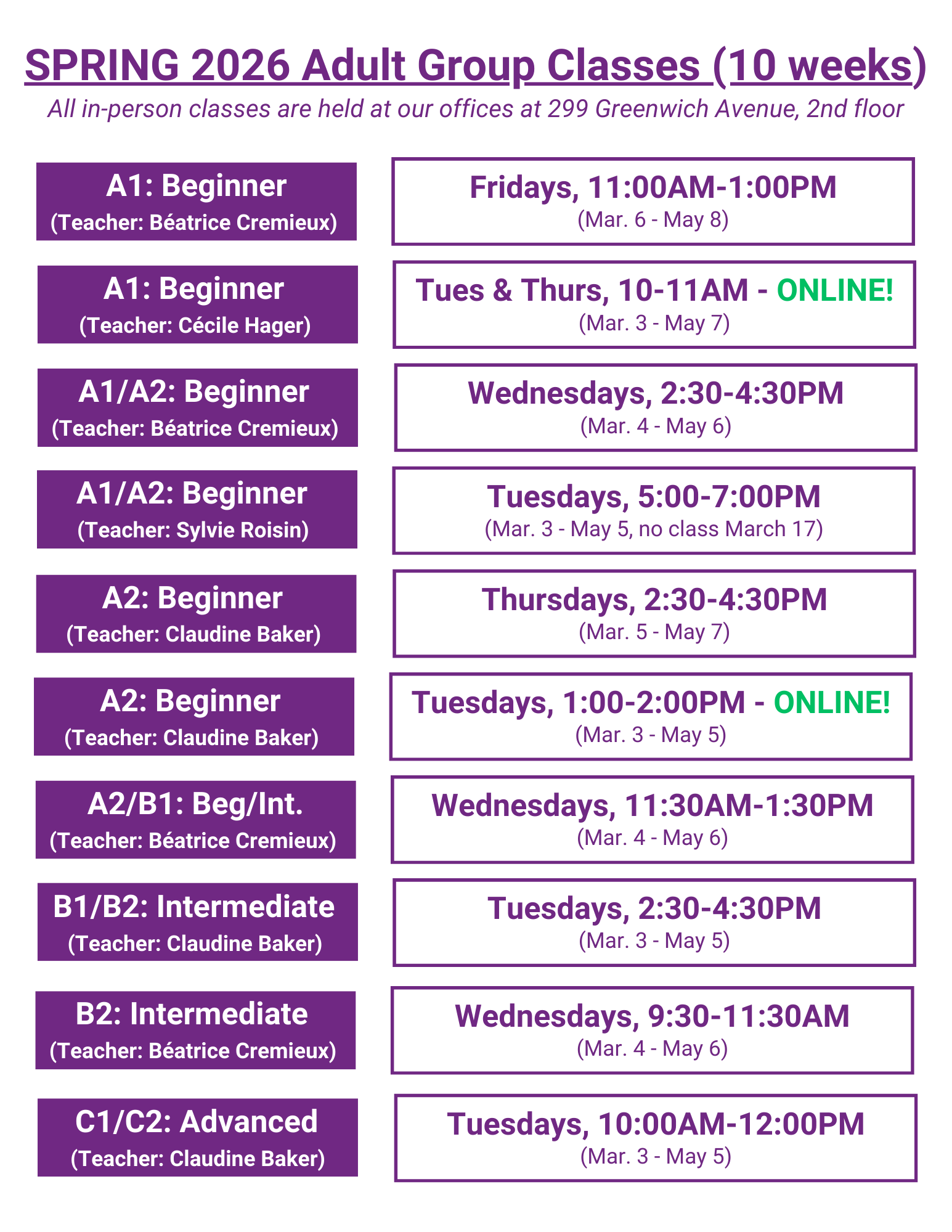 Learn French with us! The AFG offers classes and private tutoring for all ages and levels. Private and semi-private tutoring is customizable to your needs and learning style, and group classes are offered continuously throughout the year at our office on Greenwich Avenue.
